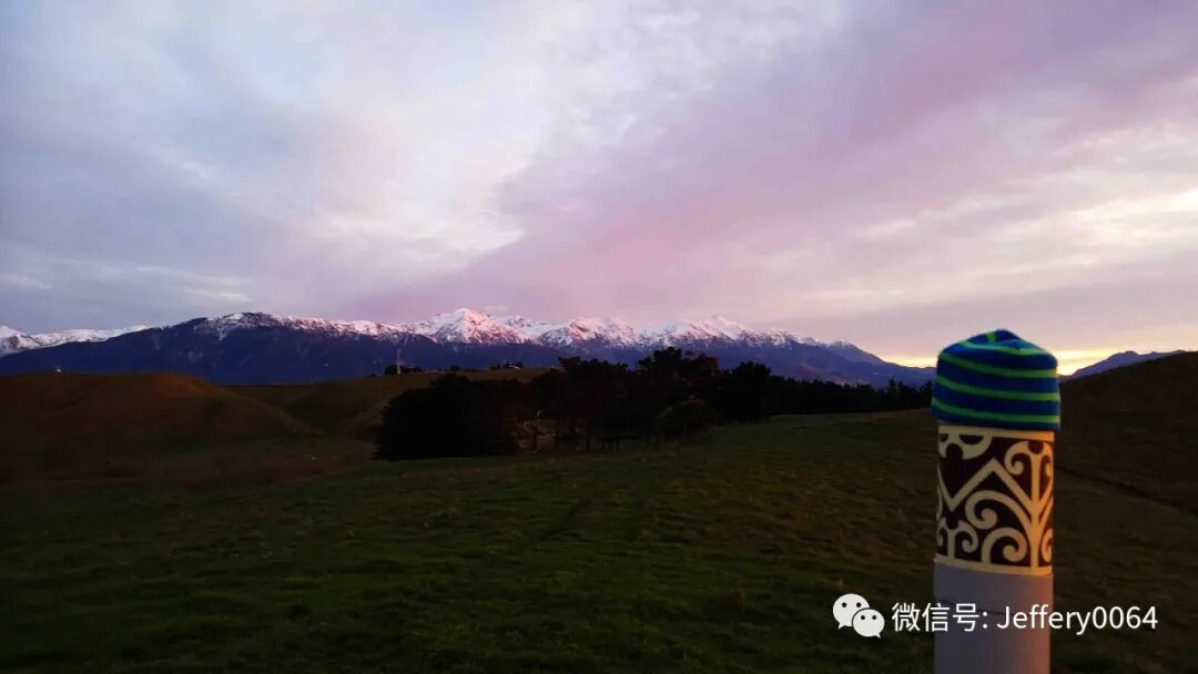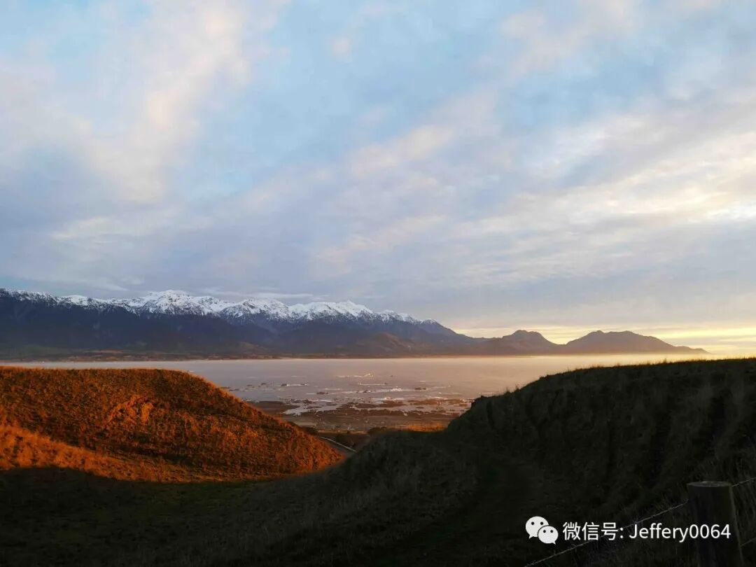 这次住的民宿位于南泥湾(South Bay),著名的凯库拉半岛步道就从这里开始。不到七点天舒就整束出发,先是毛利风格的入口,然后一条弯曲的木栈道,接下来开始缘山而上,越过低矮的一些灌木之后,就进入了私人牧场区。这时天光已经放亮了,遥远的凯库拉群山玫瑰紫的晨色中闪烁着幽幽的光茫,这条步道单程需要一个半小时,一侧是牧场一侧是悬崖,脚底下无尽的山路和牛粪。海水正好是低潮,飞鸟翔集,鸥鸦啁喳,转瞬间东方云霞如同戏剧的开幕,一下子亮了起来,耀眼得几乎不能直视,海岸线弯曲着如同伸开双臂的怀抱,迎接浪涛击打,海水湛蓝,浪花如雪,海滩上的石灰石形成弯月状的图案,画面太美,无法尽述。