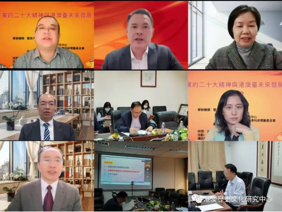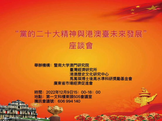 2022年12月9日15至18时30分,由暨南大学澳门研究院、台湾经济研究所、港澳历史文化研究中心、马万祺博士后高水平科研奖励基金、广东省市场经济促进会联合举办的“党的二十大精神与港澳台未来发展”座谈会在暨南大学第一文科楼五楼东头505会议室、腾讯会议同时举行,会议也同时在公众号“港澳历史文化研究中心”进行直播。